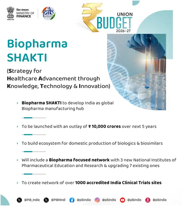 'બાયોફાર્મા શક્તિ' પહેલ હેઠળ ભારતને વૈશ્વિક બાયોફાર્મા ઉત્પાદન કેન્દ્ર બનાવવા દિશામાં મહત્વપૂર્ણ જાહેરાત કરવામાં આવી છે. દેશભરમાં 3 નવી રાષ્ટ્રીય ફાર્માસ્યુટિકલ શિક્ષણ અને સંશોધન સંસ્થાઓ સ્થાપવામાં આવશે. ઉપરાંત, હાલની 7 સંસ્થાઓને આધુનિક સુવિધાઓ સાથે અપગ્રેડ કરવામાં આવશે.