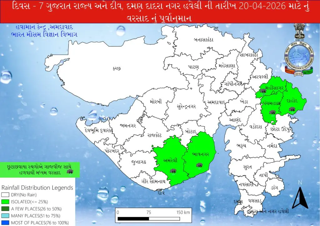 હવામાન વિભાગ અનુસાર આગામી 19 એપ્રિલના રોજ અમરેલી, ભાવનગર, સાબરકાંઠા, અરવલ્લી, મહીસાગર, દાહોદ જિલ્લામાં છૂટાછવાયા સ્થળોએ કમોસમી વરસાદ થઇ શકે છે. તેમજ 20 એપ્રિલના રોજ અમરેલી, ભાવનગર, મહીસાગર, પંચમહાલ, દાહોદ જિલ્લામાં છૂટાછવાયા સ્થળોએ ગાજવીજ સાથે કમોસમી વરસાદની આગાહી કરવામાં આવી છે.