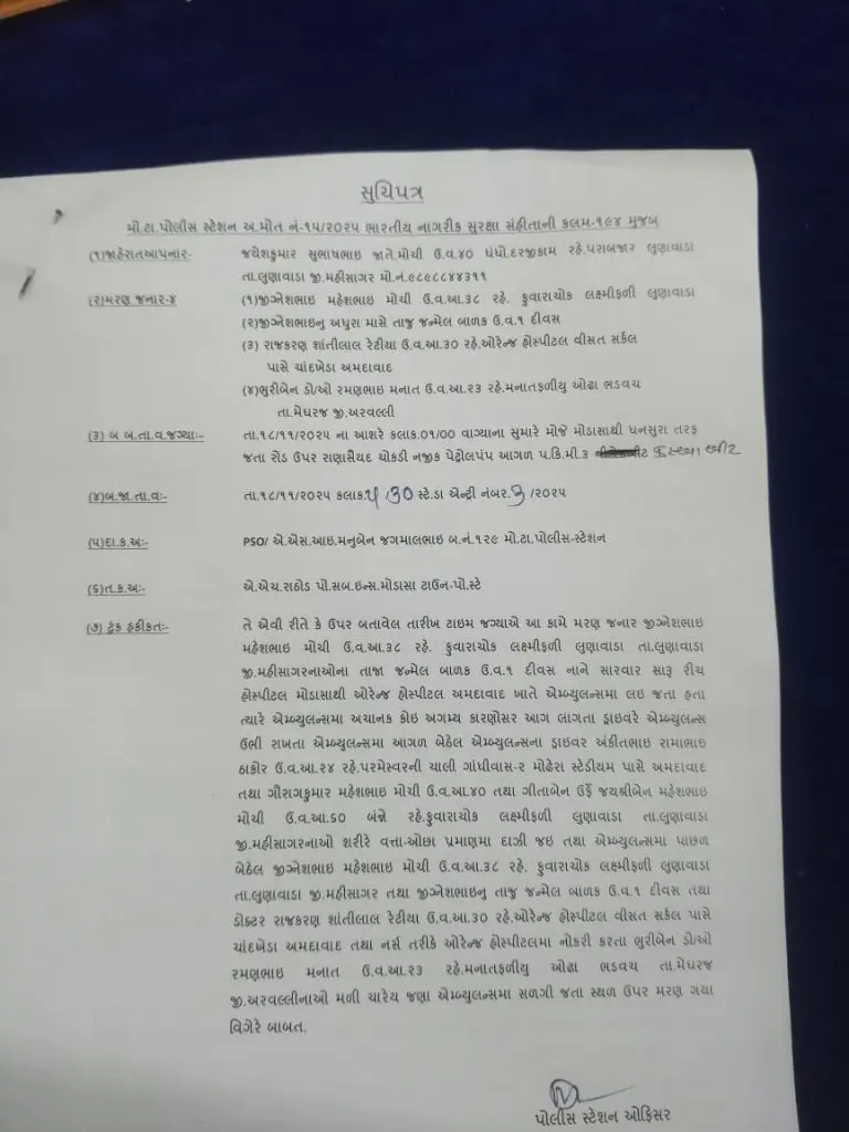 મોડાસામાં એમ્બ્યુલન્સમાં આગ લાગતાં 3 લોકોનાં ઘટના સ્થળે મોત થયા હતા. અમદાવાદની ઓરેન્જ હોસ્પિટલની એમ્બ્યુલન્સ એક દિવસના બાળકને સારવાર માટે લઈ જઈ રહી હતી. આ દરમિયાન અચાનક એમ્બ્યુલન્સમાં આગ ભભૂકી ઉઠી હતી. આગ એટલી ઝડપથી ફેલાઈ કે અંદર બેઠેલા ડોક્ટર, નર્સ અને નાના બાળકને બહાર નીકળવાનો કોઈ મોકો મળ્યો ન હતો. જેના કારણે ત્રણેય લોકો મોત થયા હતા. તેમજ ઇજાગ્રસ્તનું પણ સારવાર દરમિયાન મોત થયું છે.