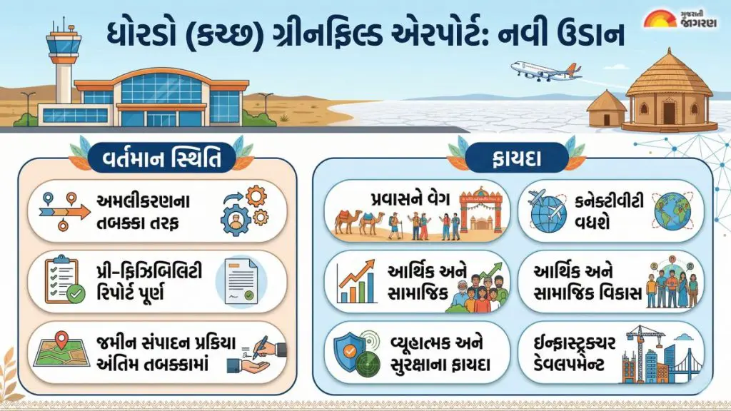 ગુજરાત સરકારના નાગરિક ઉડ્ડયન વિભાગે ધોરડો ગ્રીનફિલ્ડ એરપોર્ટ માટે પૂર્વ-ફિઝિબિલિટી રિપોર્ટ (Pre-feasibility Report) તૈયાર કરી લીધો છે, અને તેને કેન્દ્રની UDAN 5.0 યોજના હેઠળ પ્રાથમિકતા આપવામાં આવી છે. વર્ષ 2026 માં આ મહત્વાકાંક્ષી પ્રોજેક્ટ માટે જમીન સર્વેક્ષણની કામગીરી હાલ ચાલી રહી છે.