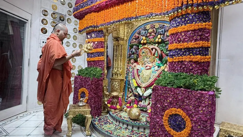 Salangpur Hanumanji: સુપ્રસિદ્ધ યાત્રાધામ સાળંગપુરધામ શ્રીકષ્ટભંજનદેવ હનુમાનજી મંદિર ખાતે શાસ્ત્રી સ્વામી હરિપ્રકાશદાસજી (અથાણાવાળા)ની પ્રેરણાથી તેમજ કોઠારી વિવેકસાગરદાસજી સ્વામીના માર્ગદર્શનથી તારીખ 15-11-2025, શનિવાર અને અગિયારશના રોજ શ્રીકષ્ટભંજનદેવ હનુમાનજીને દિવ્ય શણગાર કરવામાં આવ્યો હતો. આજે સવારે મંગળા આરતી પૂજારી સ્વામી અને શણગાર આરતી શાસ્ત્રી હરિપ્રકાશ સ્વામીએ કરી હતી.