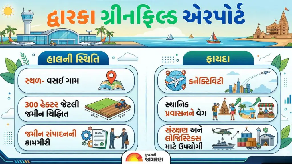 Dwarka Greenfield Airport: દેવભૂમિ દ્વારકા એક અત્યંત મહત્વપૂર્ણ ધાર્મિક પ્રવાસન કેન્દ્ર હોવાથી, ગુજરાત સરકાર અને કેન્દ્ર સરકાર દ્વારા અહીં નવું ગ્રીનફિલ્ડ એરપોર્ટ બનાવવાની પ્રક્રિયાને વધુ ઝડપી બનાવવામાં આવી છે. આ પ્રોજેક્ટને 'ફાસ્ટ ટ્રેક' પર રાખવામાં આવ્યો છે, જેથી દ્વારકા અને શિવરાજપુર બીચને આંતરરાષ્ટ્રીય પ્રવાસન નકશા પર મૂકી શકાય.