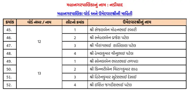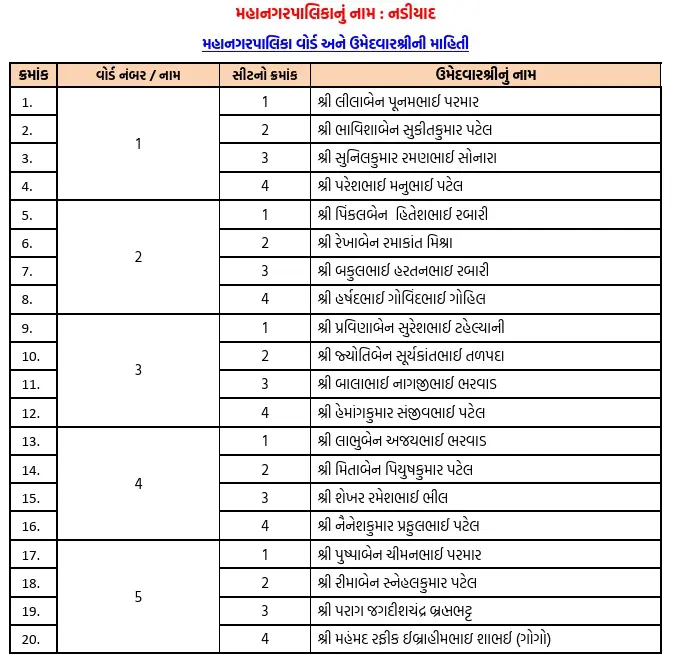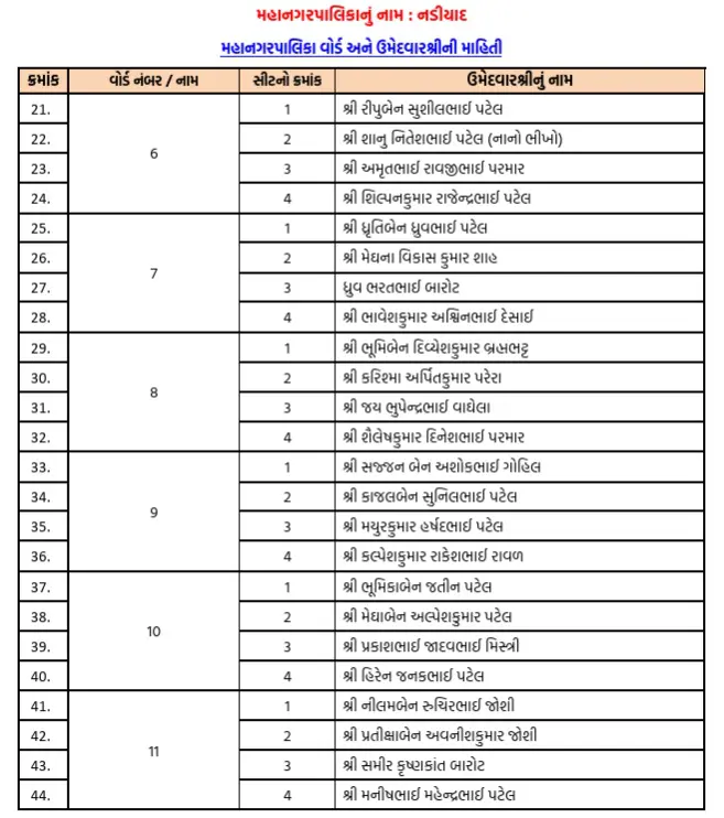 ગાંધીનગર સ્થિત ભાજપના પ્રદેશ કાર્યાલય શ્રી કમલમ્ દ્વારા ગત 9 એપ્રિલ, ગુરુવારના રોજ નડિયાદ મહાનગરપાલિકાના ઉમેદવારોની અંતિમ યાદી સત્તાવાર રીતે જાહેર કરવામાં આવી છે. ભાજપના મોવડીમંડળે લાંબી મંથન પ્રક્રિયા બાદ આ નામ પર મહોર મારી છે.