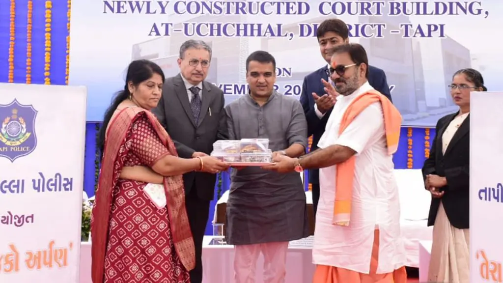 Tapi News: ગુજરાત રાજ્યના નાયબ મુખ્યમંત્રી હર્ષ સંઘવીએ આજે તાપી જિલ્લાના ઉચ્છલ તાલુકા ખાતે નવીન સિવિલ ન્યાય મંદિરનું લોકાર્પણ કર્યું હતું. અંદાજિત રૂ. 7 કરોડના ખર્ચે નિર્મિત આ આધુનિક ન્યાય મંદિર સ્થાનિક નાગરિકોને ન્યાયાલય સંબંધિત સેવાઓ સરળતા અને સુવિધાથી ઉપલબ્ધ કરાવશે. હર્ષ સંઘવીએ જણાવ્યું કે, પ્રત્યેક નાગરિકને ઝડપી, સરળ અને પારદર્શક ન્યાય મળવો એ બંધારણીય અધિકાર છે, જેની પૂર્તિ માટે સરકાર અને ન્યાયતંત્ર ખભે ખભા મિલાવી સતત કાર્યરત છે.