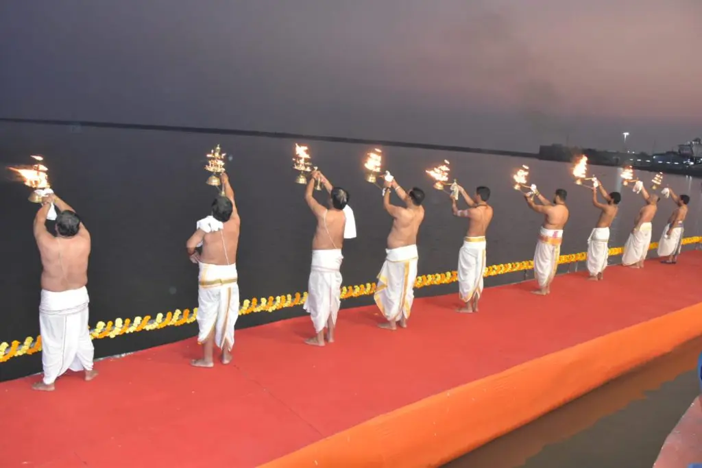 હિરણ, કપિલા અને સરસ્વતી નદીનું જ્યાં પવિત્ર મિલન થાય છે, તેવા અરબી સમુદ્રના ત્રિવેણી સંગમ સ્થળ પર સાંસદ સહિતના મહાનુભાવોએ આદ્યાત્મિક અને દિવ્ય માહોલમાં ‘સંગમ આરતી’ કરી હતી. સોમપુરા તીર્થ પુરોહિતોની વેદની ઋચાઓના ગાન સાથે ત્રિવેણી ઘાટ પરનો માહોલ સંપૂર્ણ રીતે આધ્યાત્મિકતાના રંગે રંગાયો હતો.