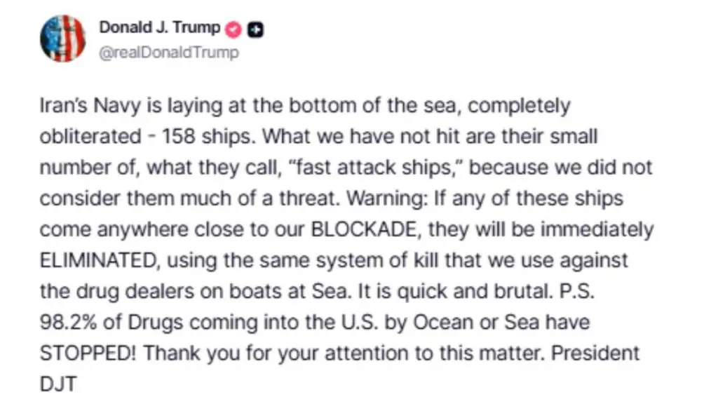ટ્રમ્પે ઈરાનને ચેતવણી આપતા લખ્યું, જો આમાંથી કોઈપણ જહાજ અમારા નાકાબંધીની નજીક આવશે, તો તેને તાત્કાલિક નાશ કરવામાં આવશે. ઠીક તેવી જ રીતે જેવી રીતે અમે દરિયામાં બોટ પર ડ્રગ હેરફેર કરનારાઓ સામે અમે જે યુક્તિઓનો ઉપયોગ કરીએ છીએ. ટ્રમ્પે આગળ કહ્યું, આ ખૂબ જ ઝડપી અને નિર્દય અભિગમ છે. P.S. દરિયાઈ માર્ગે યુ.એસ.માં આવતા 98.2% માદક દ્રવ્ય હવે સંપૂર્ણપણે બંધ થઈ ગયા છે.