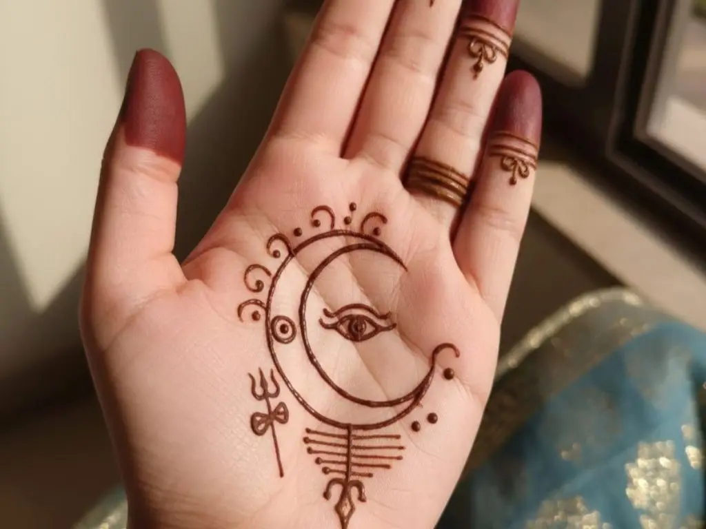 શિવજીના મસ્તક પર બિરાજમાન અર્ધચંદ્રાકાર અને તેમના હાથમાં રહેલું ડમરુ મહેંદીમાં કંડારવું એક અનોખો વિચાર છે. આ બંને તત્વોને જોડીને એક નાની અને આકર્ષક પેટર્ન તૈયાર કરી શકાય છે.