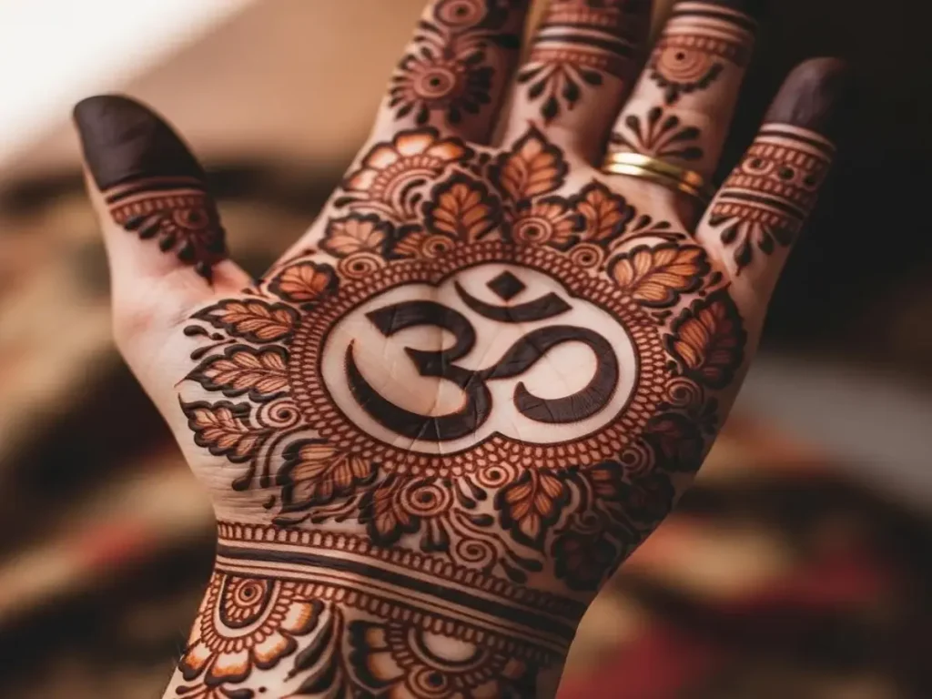 'ૐ' એ બ્રહ્માંડનો નાદ છે. હથેળીમાં મધ્યમાં મોટો 'ૐ' લખી તેની ફરતે વર્તુળ કે ફૂલની પાંખડીઓ જેવી ડિઝાઇન કરવાથી હાથ ખૂબ જ ભવ્ય લાગે છે. આ ડિઝાઇન શાંતિ અને સકારાત્મકતાનો અહેસાસ કરાવે છે.