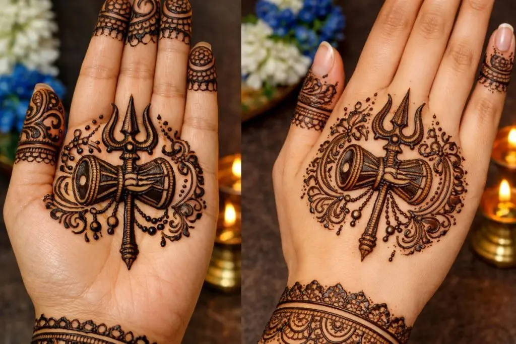ભગવાન શિવનું શસ્ત્ર એટલે ત્રિશૂળ. હથેળીની મધ્યમાં અથવા કાંડાના ભાગે નાનું અને સુરેખ ત્રિશૂળ દોરવાથી મહેંદીને ધાર્મિક લુક મળે છે. તેની આસપાસ નાના ટપકાં કે વેલ બનાવીને તેને વધુ સુંદર બનાવી શકાય છે.