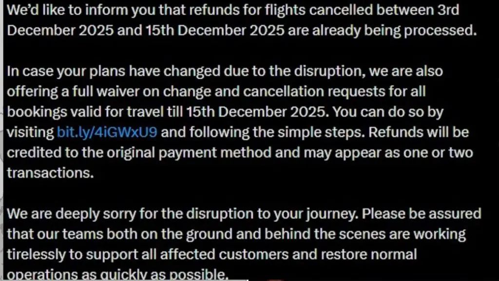 ઇન્ડિગોએ એમ પણ જણાવ્યું હતું કે ટિકિટમાં ફેરફાર અથવા રદ કરવા માટે કોઈ વધુ શુલ્ક લેવામાં આવશે નહીં. કંપનીએ X પર પોસ્ટ કર્યું- અસુવિધા બદલ અમને ખૂબ જ દુઃખ છે. અમારી ટીમો સ્થિતિ સામાન્ય બનાવવા માટે કામ કરી રહી છે.