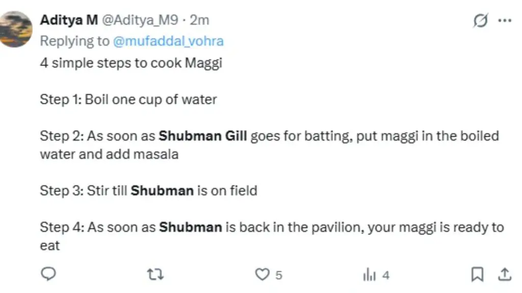 ગિલના વહેલા આઉટ થવાને કારણે સોશિયલ મીડિયા પર ચાહકોએ રોષ વ્યક્ત કર્યો હતો. તેને ટ્રોલ કરતા એક યુઝરે લખ્યું હતું કે, 'જ્યાં સુધી ગિલ બેટિંગ કરી રહ્યો હોય, ત્યાં સુધીમાં મેગી બનાવી લો,' જેનો સીધો અર્થ છે કે તે ક્રિઝ પર બહુ ઓછો સમય ટક્યો હતો.