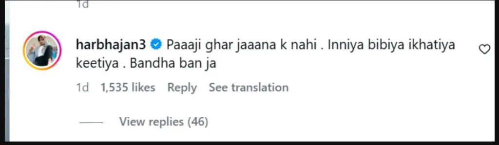 ભૂતપૂર્વ ક્રિકેટર હરભજન સિંહે યુવરાજ સિંહના ફોટા પર કટાક્ષ કર્યો. તેણે મજેદાર કૉમેન્ટ કરી લખ્યું- પાજી, તમે ઘરે જવા માંગો છો કે નહીં?આટલી બધી યુવતીઓને ભેગી કરી છે. સારા વ્યક્તિ બની જાવ. હવે જોવાનું રહ્યું કે યુવરાજ આનો કેવો પ્રતિભાવ આપે છે.